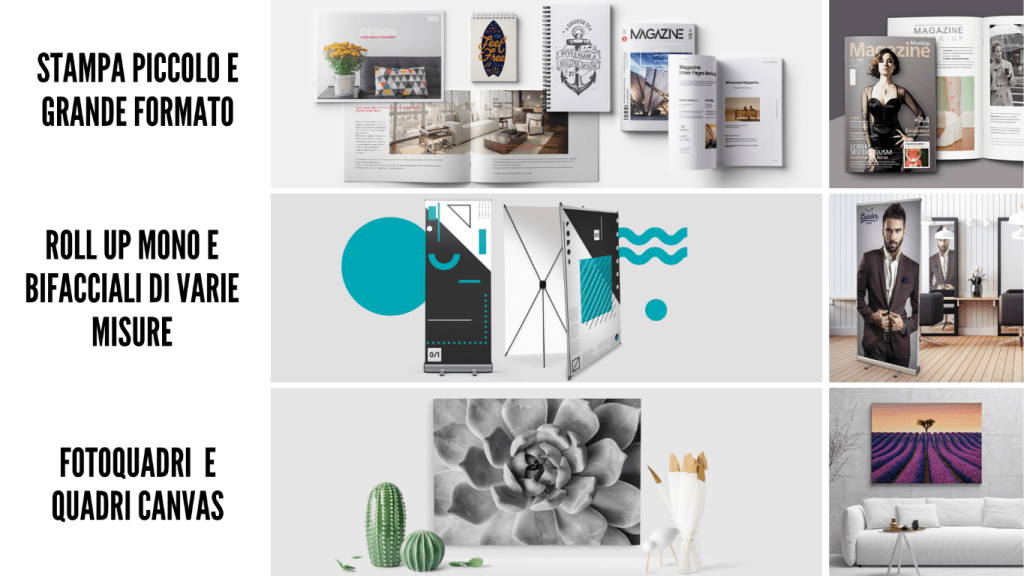 Inoltre offriamo ai nostri clienti servizi di progettazione grafica, postproduzione fotografica, stampa di piccolo e grande formato, gadget promozionali e abbigliamento personalizzato.